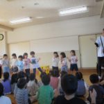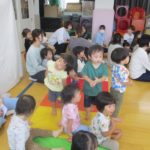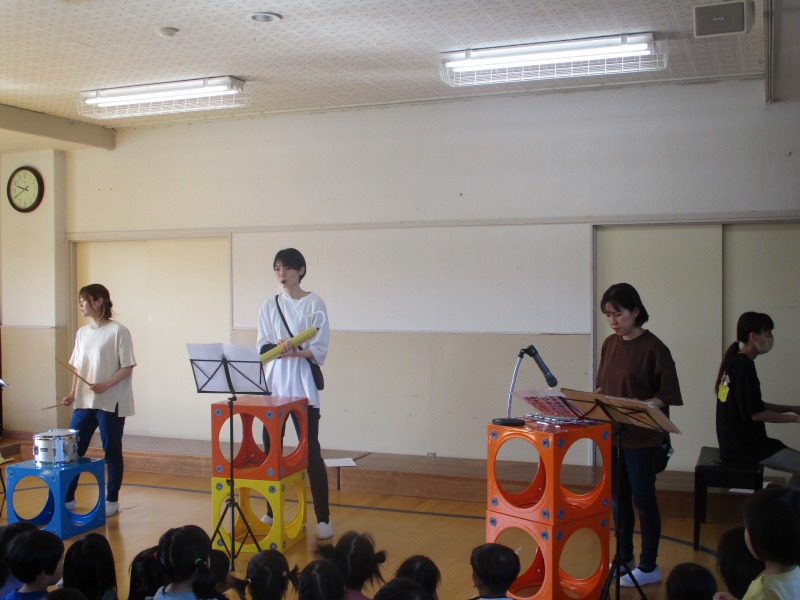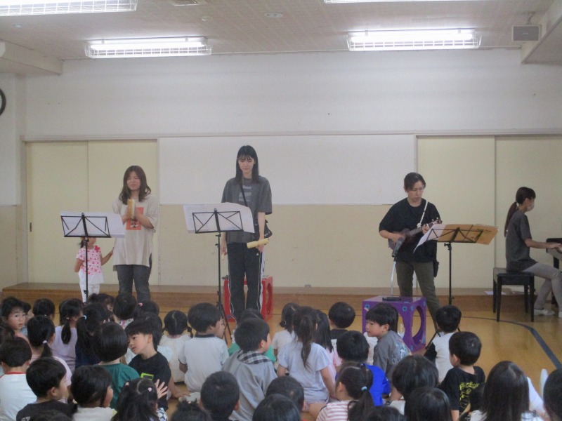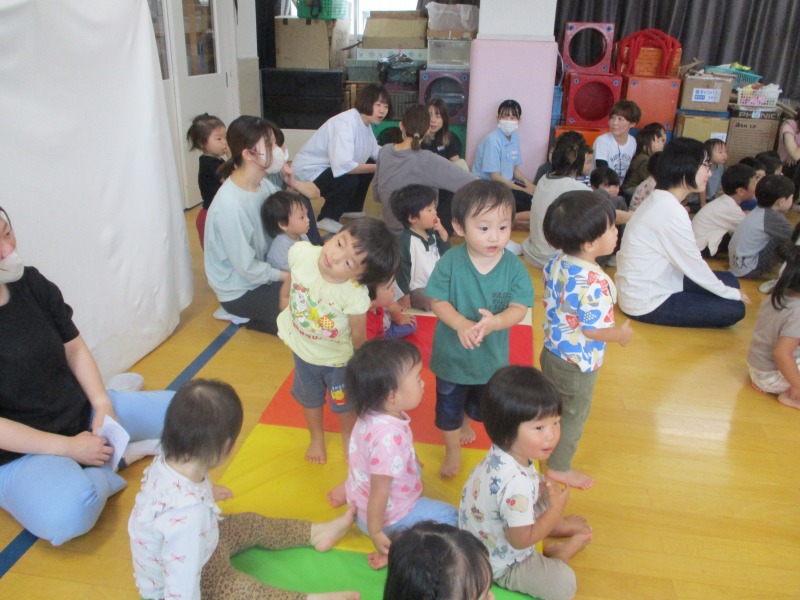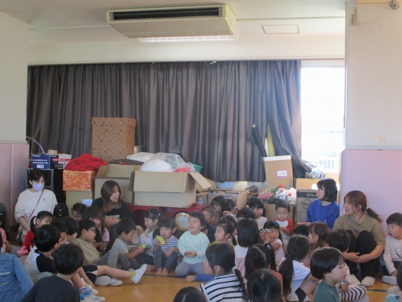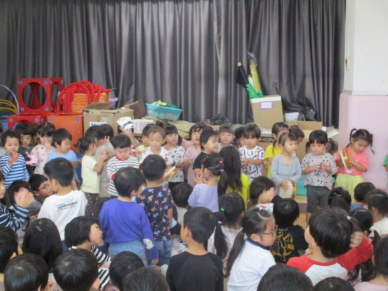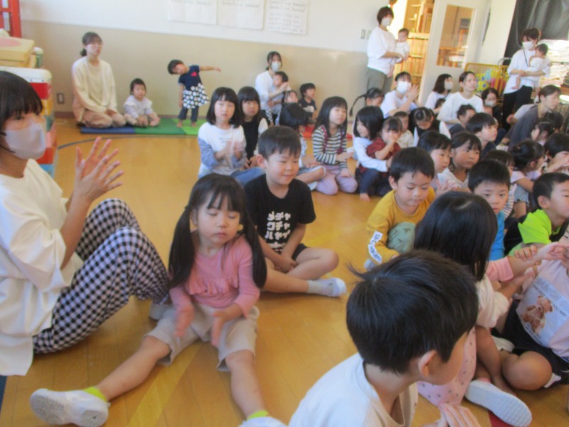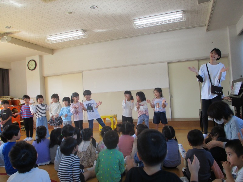今月は、うさぎ組さんが、楽器や手づくりの動物のパクパクで「山の音楽家」を盛り上げてくれています。歌に合わせて、楽器を鳴らす姿、とてもかわいいです。他のクラスのお友だちも終わると、大きな拍手をしてくれています。