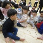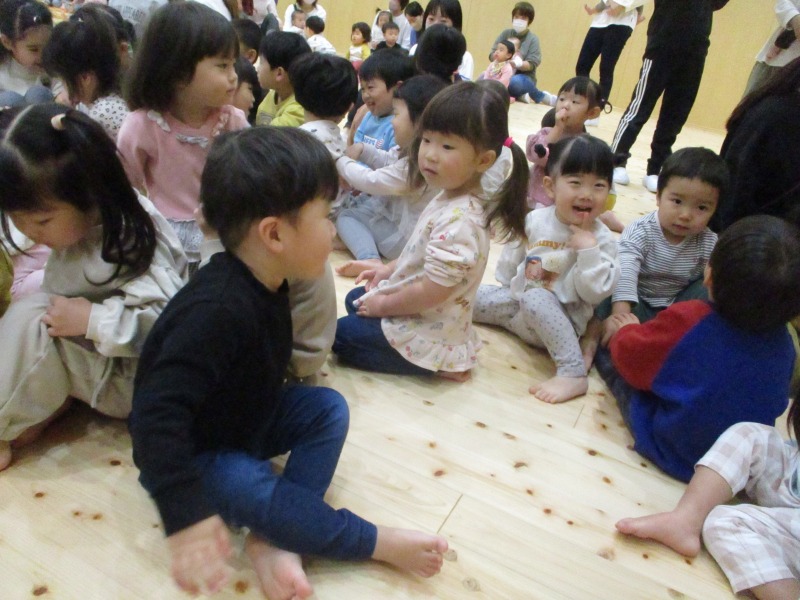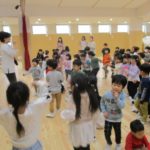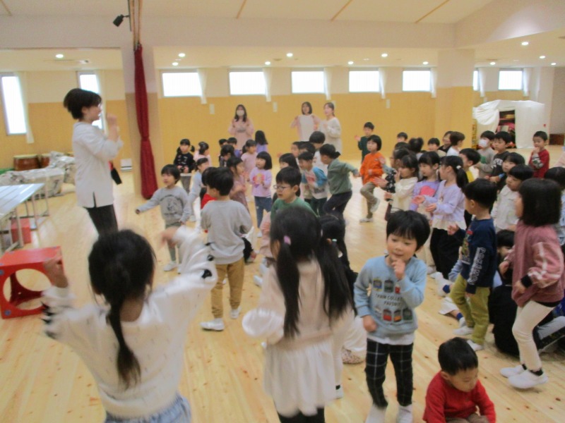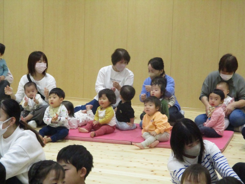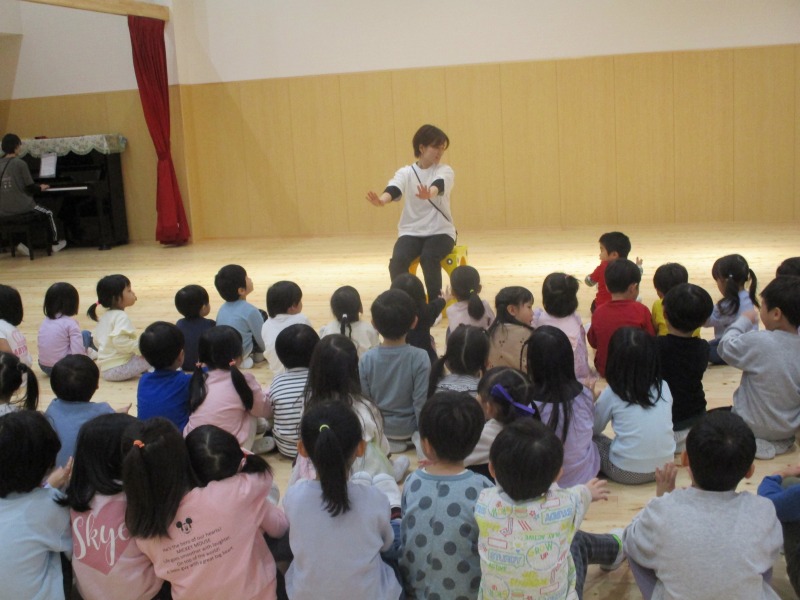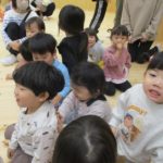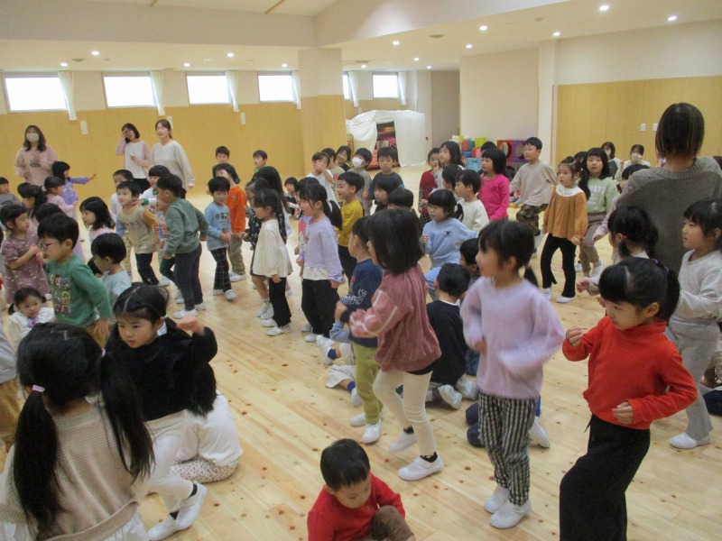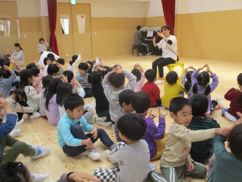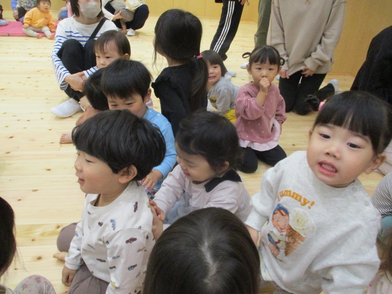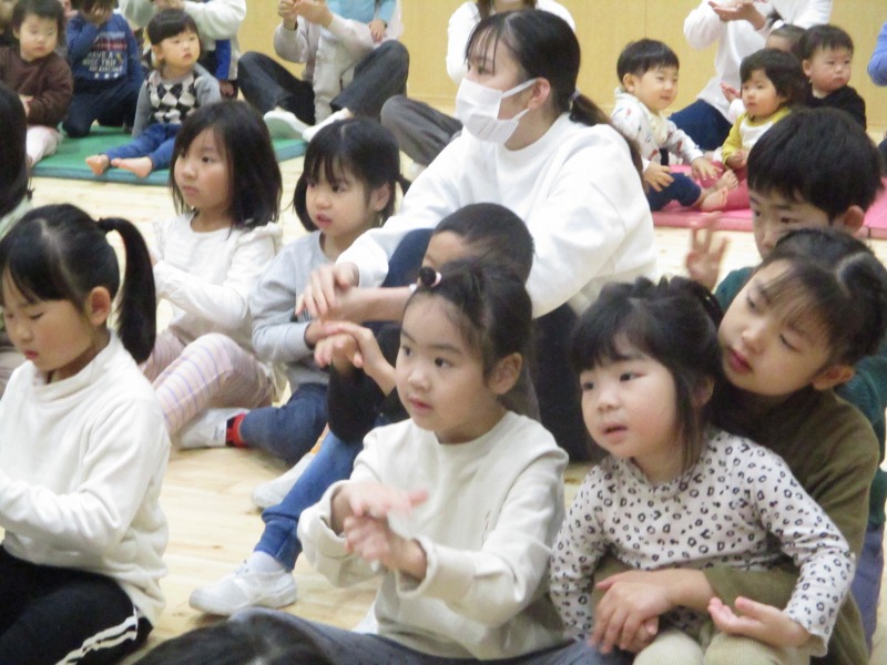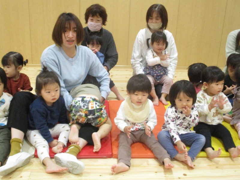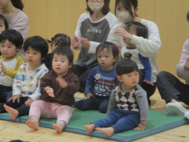今月の手遊びは、少し考えながら手を動かす遊びです。初めは、「えっ?」「むずかしい」と言っている姿が見られましたが、回を重ねる毎に「できたー」の声も増えています。ボディーパーカッションでは、身体を動かしながら楽しめるので、小さなクラスのお友だちも手を叩いたりお腹を叩いたりしながら様子が見られています。
