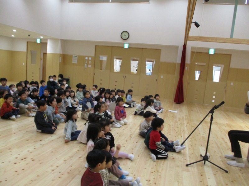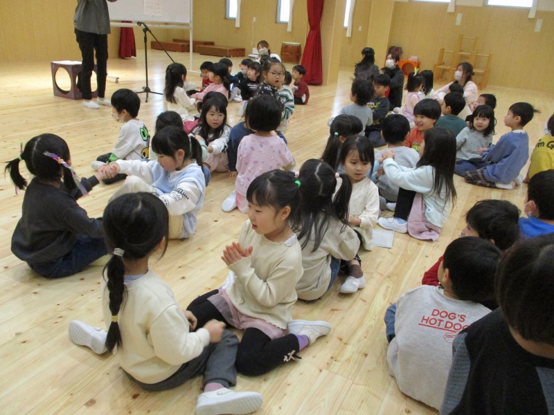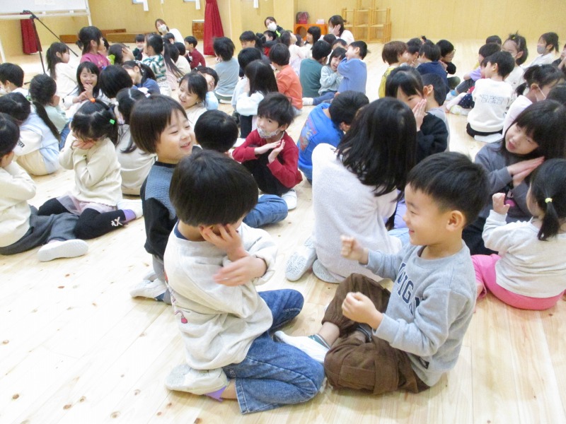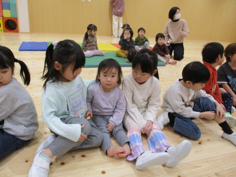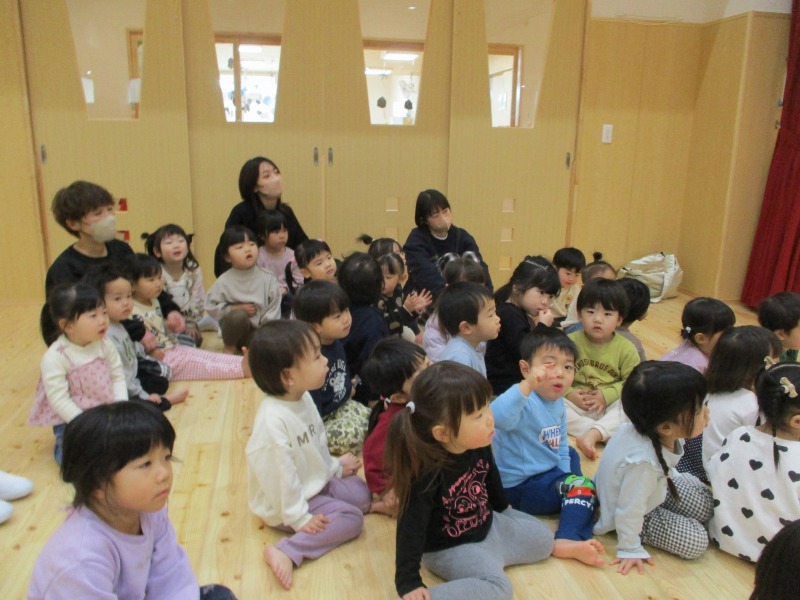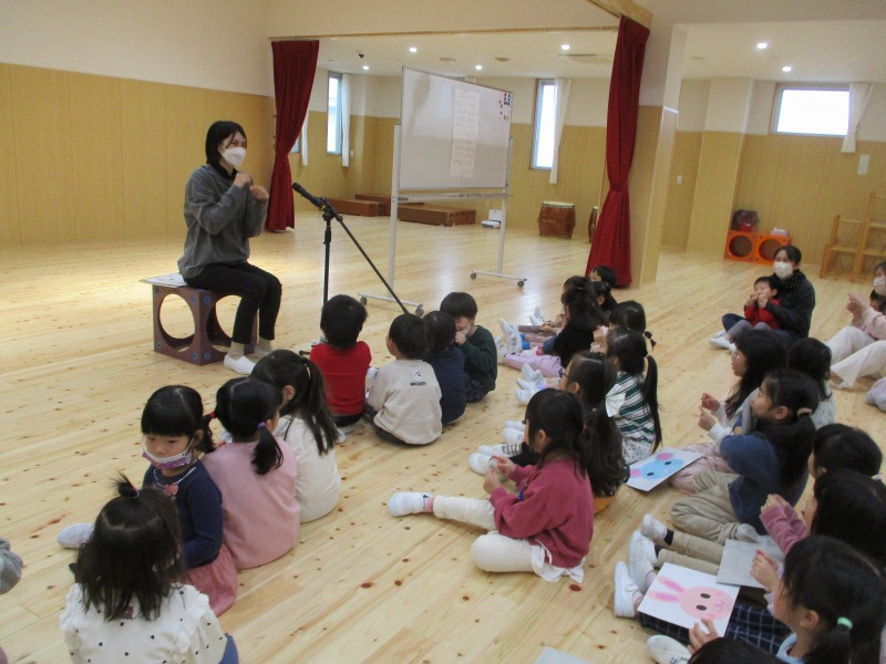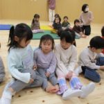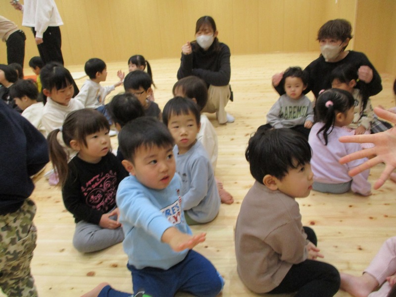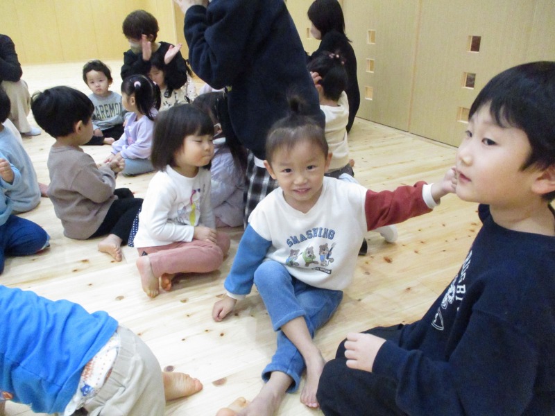 今月は、十二支の歌の際に、ぱんだ組のお友だちが、前に出てきて、干支のパネルを提示してくれています。はたらくくるまでは、どのクラスも盛り上がっており、繰り返しで乗り物を言う所では、大きな声が、毎回聞かれています。また、わらべ歌では、お友だちと向かい合って、行っており、最後のじゃんけんでは、勝ち負けが決まるのでどの子も真剣な表情です。また、ご家庭でもお子さんと一緒に歌ってみてください。
