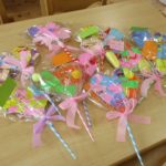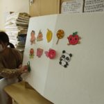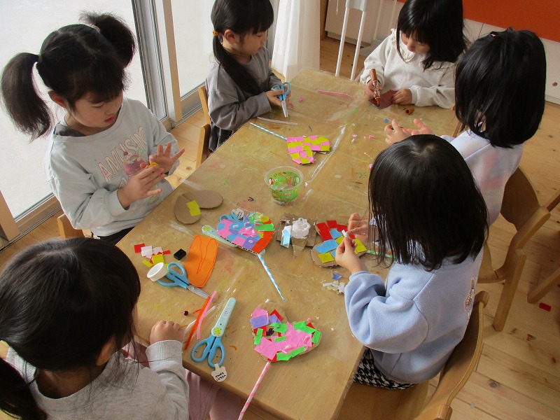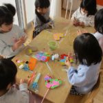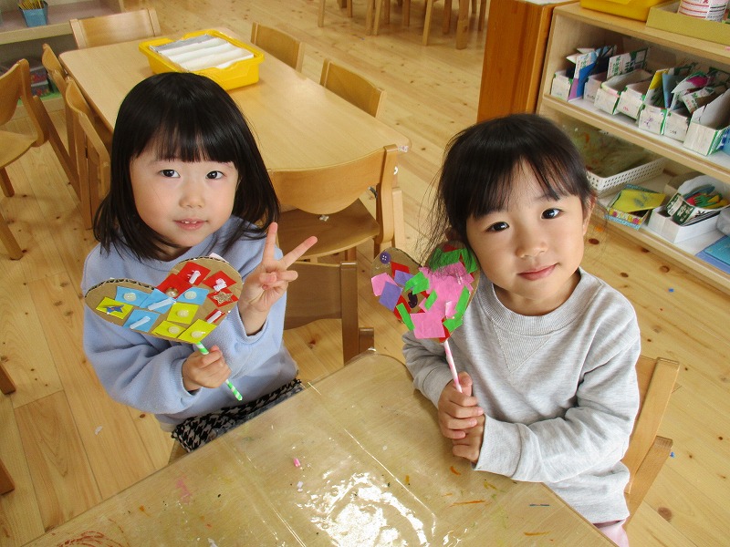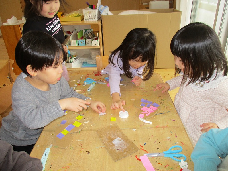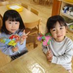 制作コーナーでは、廃材や紙、ボタンやモールなどのたくさんの素材の中から自分の作りたいものを考え、選び、ハサミやのりを使って制作しています。自分で考えて作っているものが、完成した時の達成感は嬉しいようで、「見て~!」と友だちや保育者に見せてくれます。