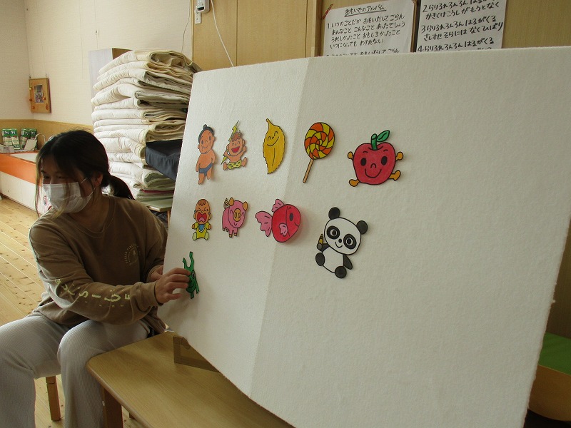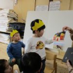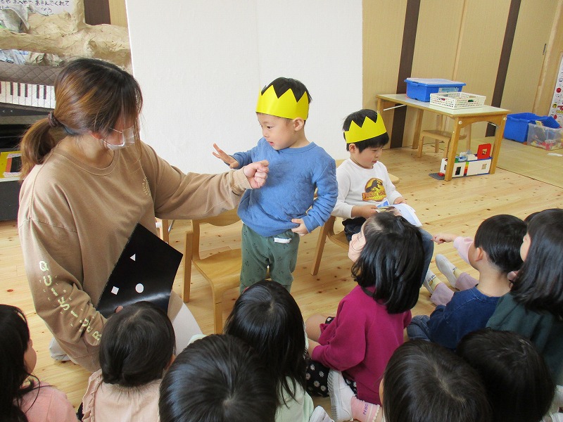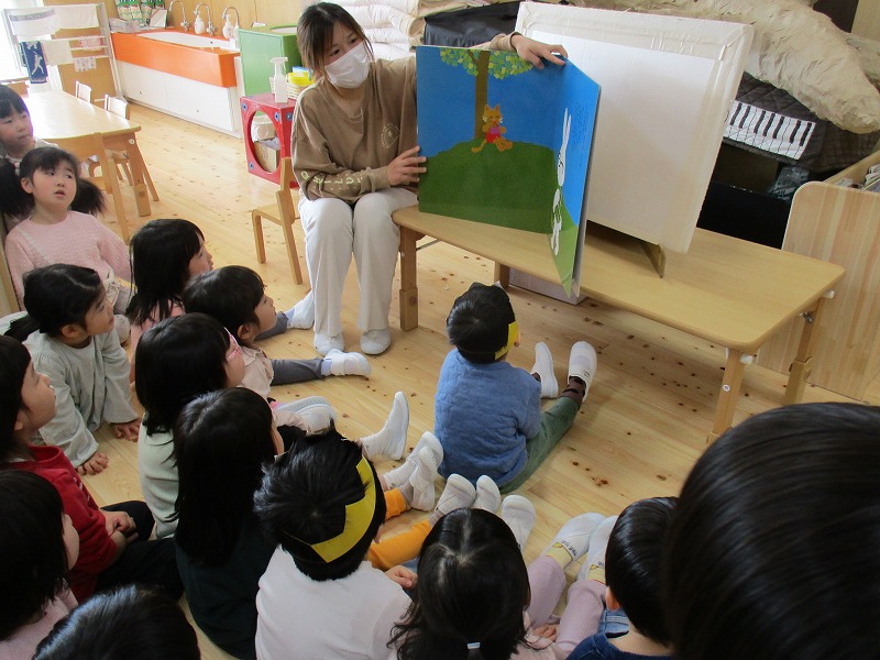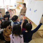 2月は2人のお友だちが誕生日を迎えました。”おちたおちた”の手遊びから始まり、誕生児のインタビュー、好きなもの当てクイズをしました。穴の中からの好きなキャラクターと好きな食べ物をントを見て、すぐに分かる子が多くいました。その後は、「先生の好きなキャラクター、好きな食べ物はどっちだ?」の2択クイズをしました。難しかったようで、毎回意見が半々でした。最後は”おばけのてんぷら”の大型絵本を見ました。