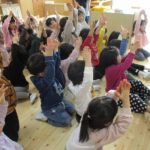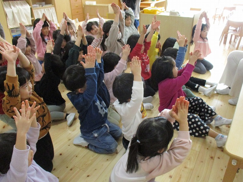節分の由来を聞き、鬼の苦手な物をクイズ形式で楽しみながら学びました。その後「おにのパンツ」の曲と共に、元気に「鬼はそとー!福はうちー!」と掛け声をかけながら豆まきをしました。最後は「まめのかぞえうた」の絵本を見ました。「鬼、おらんくなった!」と爽やかな笑顔の子どもたちでした。