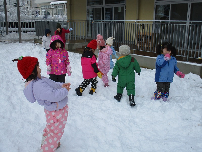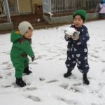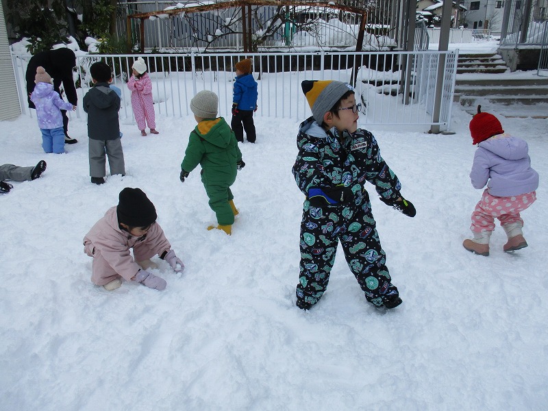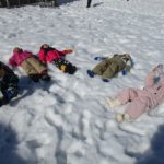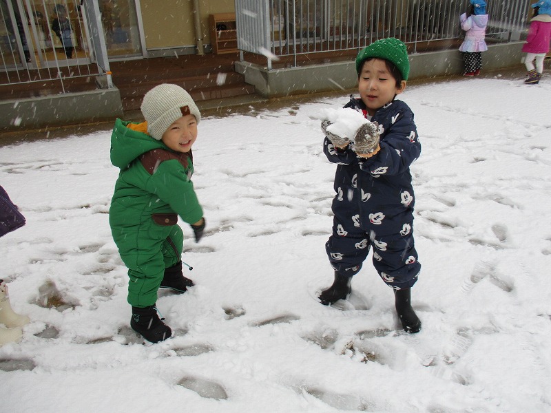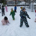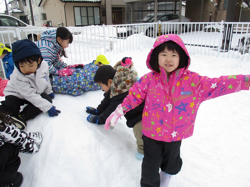 子ども達が楽しみにしていた、雪がやっと積もり、園庭で雪遊びができました。ワクワクしていた子ども達、一生懸命スキーウェアに着替えていて可愛らしかったです。雪だるまを作ったり、かまくらに入ったり、寝転んだり、それぞれ楽しんでいました。