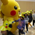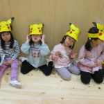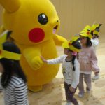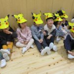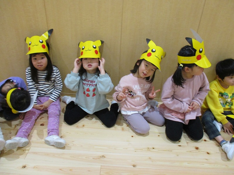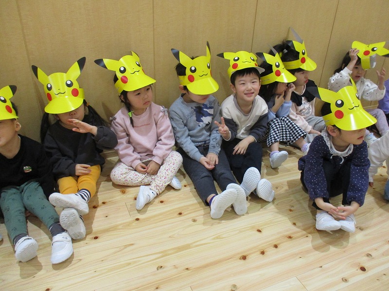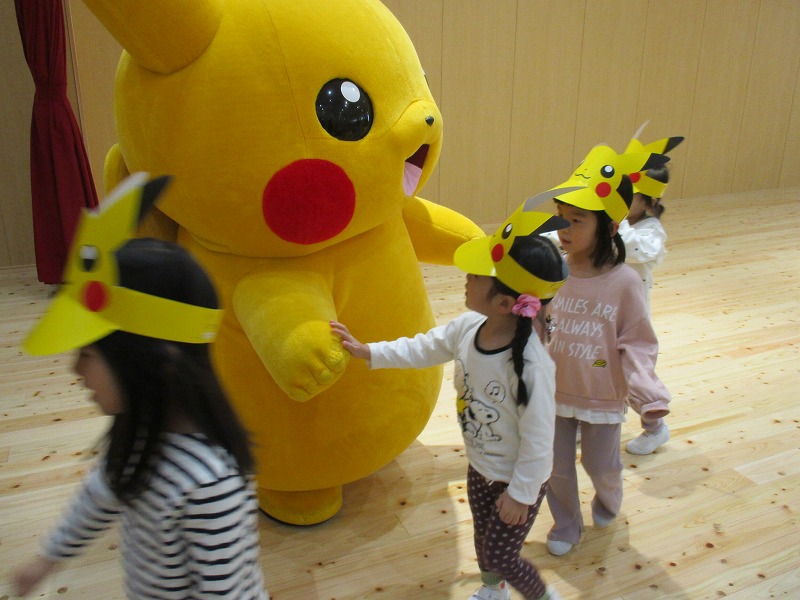 ピカチュウのサンバイザーを被り、ピカチュウをお迎えする準備満タン!大きな声で「ピカチュウ~!!!」と呼び、登場すると、目をキラキラさせながら、「かわいい~!」という子が多く、嬉しそうに見ていました。映像を見ながらダンスを踊ったり、ハイタッチをしたりと、最後まで楽しんでいた子ども達です。
