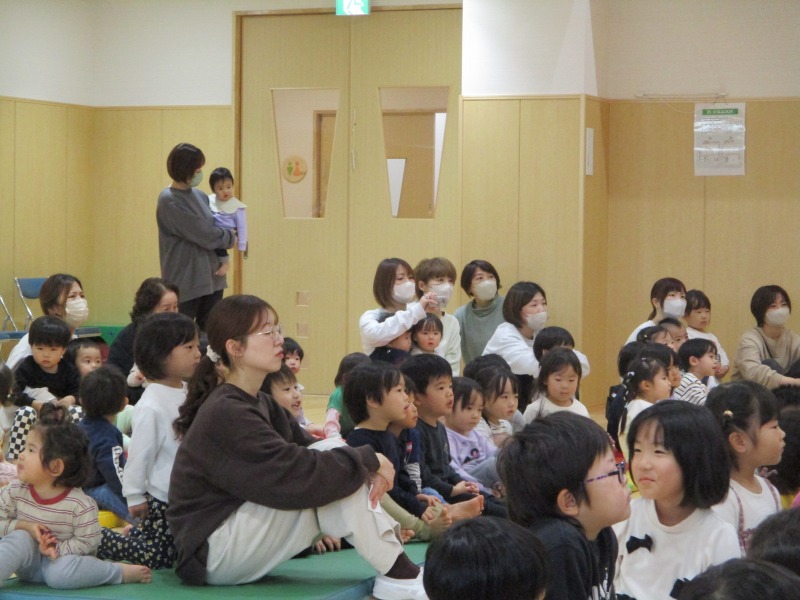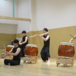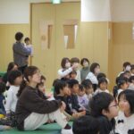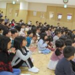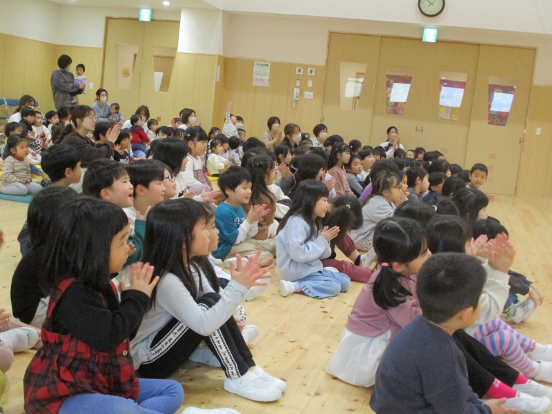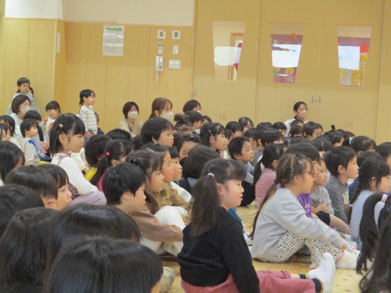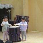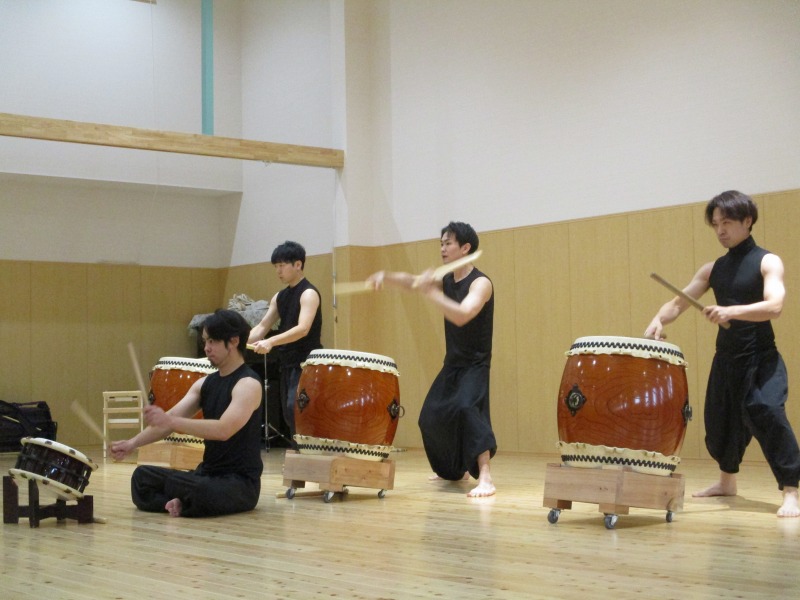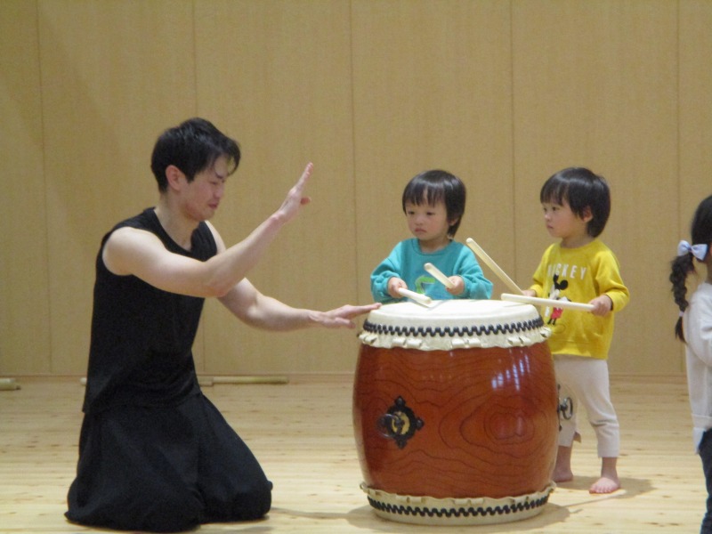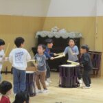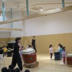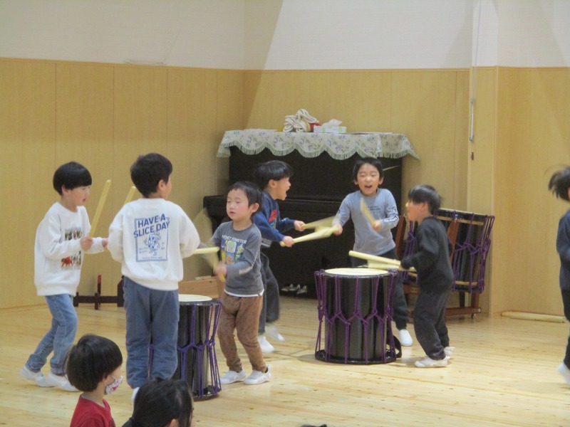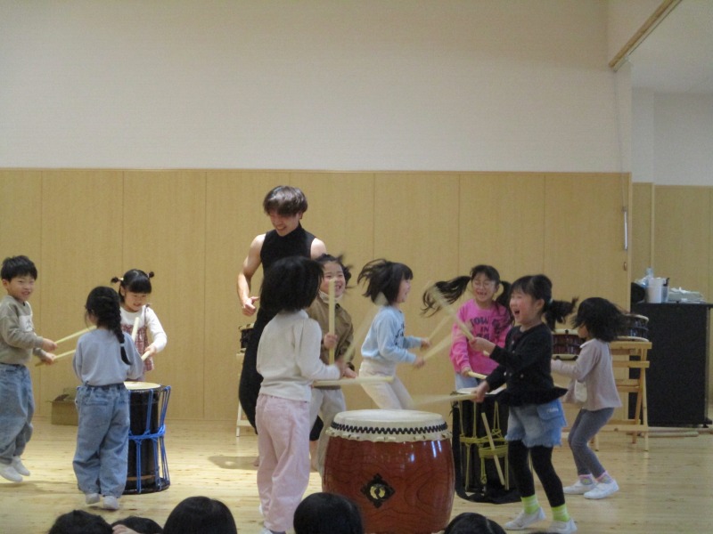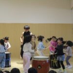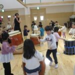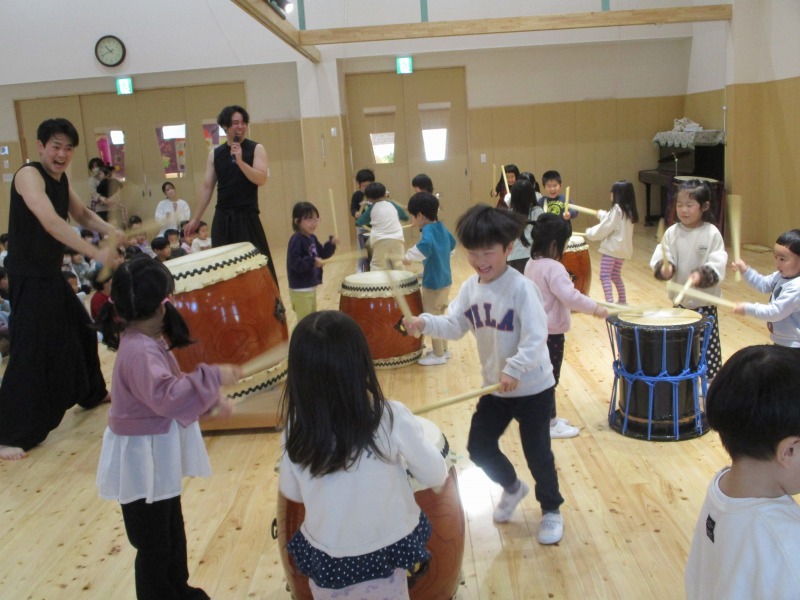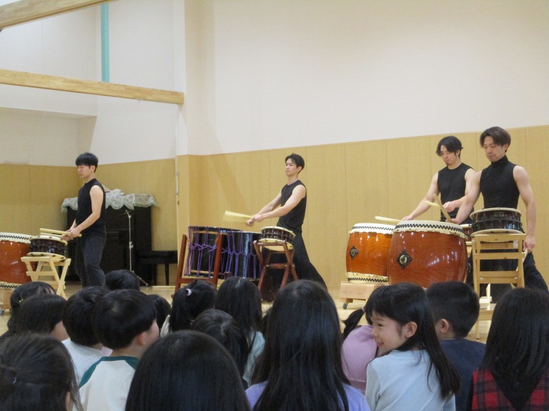「どんどんたいむ」で子どもたちに指導してくださっている巽絢也先生をはじめとする、4名の金沢和太鼓同好会の方が来てくださり、「命」「酔狂」などの和太鼓の曲を演奏してくださいました。和太鼓のお腹に響くような大きな音や演奏者の迫力ある表現に子どもたちも夢中になり、真剣な表情で聴き入っていました。曲が終わると、大きな拍手と共に「ブラボー!」と歓声を送る子もおり、心から演奏を楽しんでいる様子が伝わってきました。演奏者の方から「もっと声を出したりして聴いてもいいよ」と声をかけられると、「がんばーれ!がんばーれ!」と掛け声を出したり手を叩いたりして応援する姿も見られました。演奏の後は、クラスごとに和太鼓を叩く体験をさせてもらいました。体を動かしたり、声を出したりして思いきり和太鼓を叩く楽しさを教えてもらい、ニコニコ笑顔で楽しんでいた子どもたちでした。
