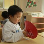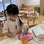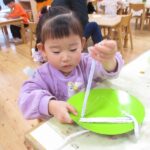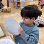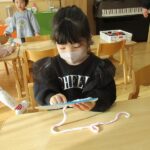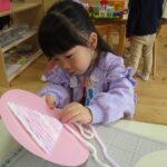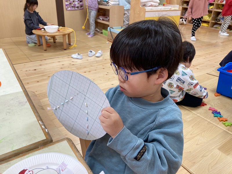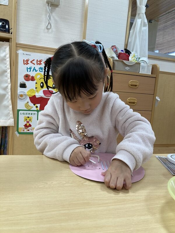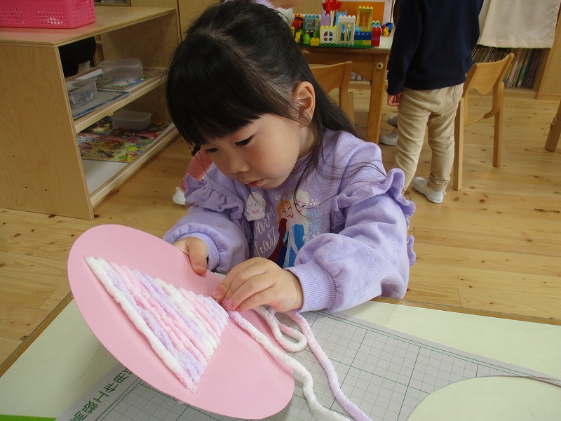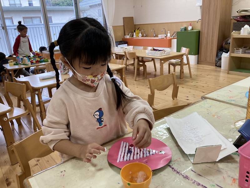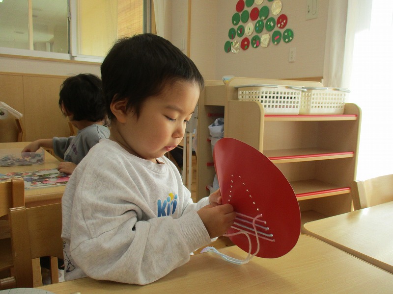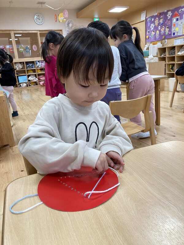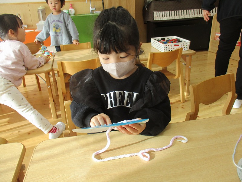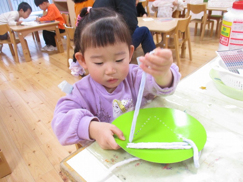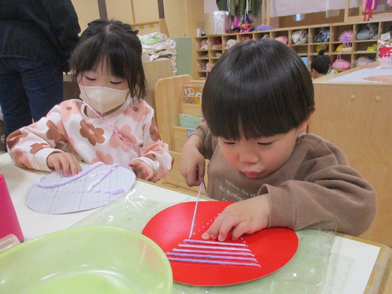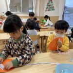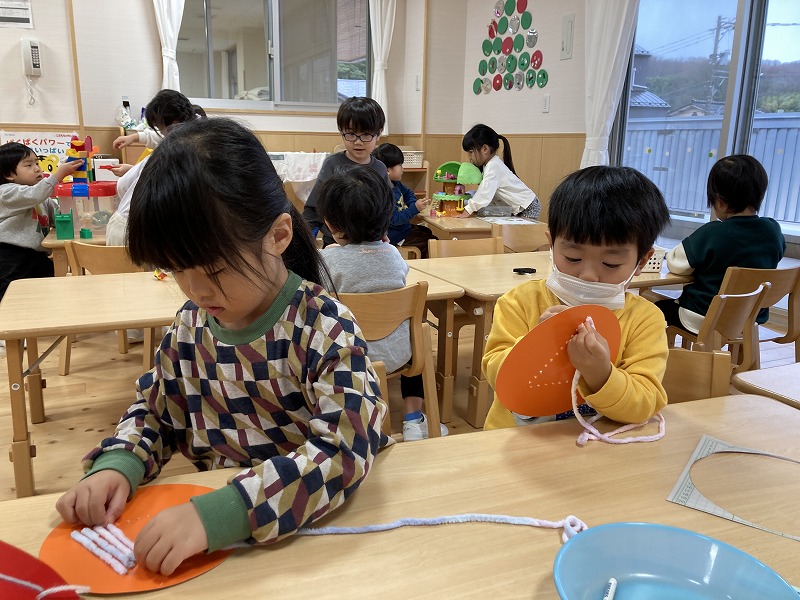 クリスマスにちなんだ制作を行いました。工作用紙に開けた穴に毛糸を通し、ツリーの形を作りました。毛糸を通す動作では、指先を上手に使いながら集中して取り組む姿が見られました。