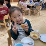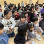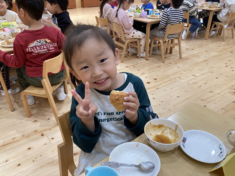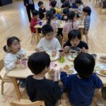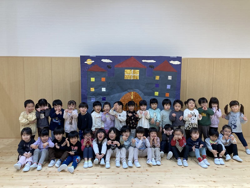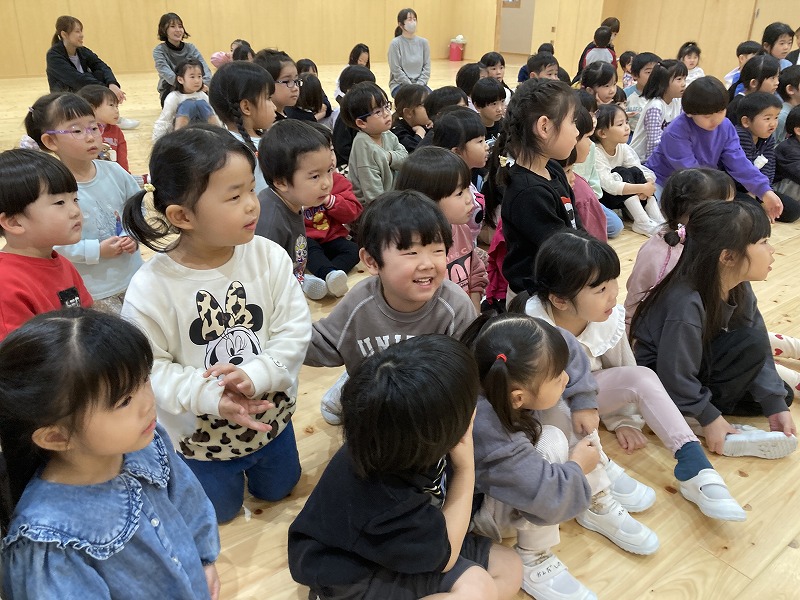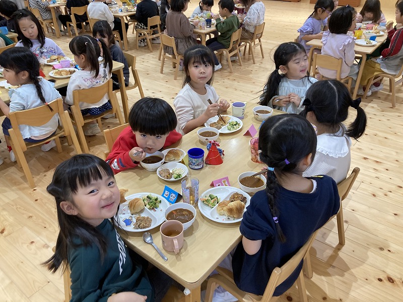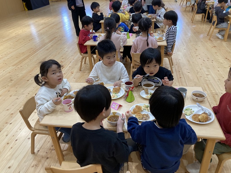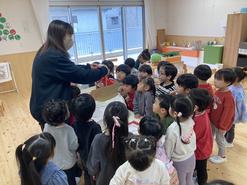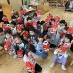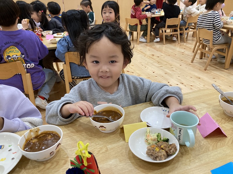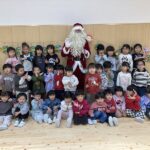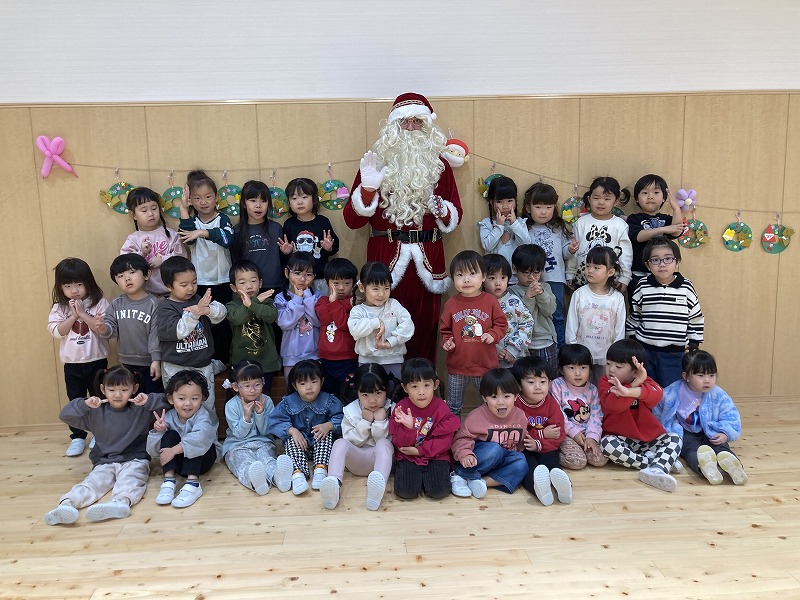 クリスマス会にサンタクロースが遊びに来てくれました。朝から、「今日サンタさん来るかな~?」とずっと楽しみにした子ども達。サンタさんに質問をしたり、一緒に歌を歌ったりと楽しい時間を過ごし、大満足な様子でした。プレゼントは、子ども達の大好きなブロックを頂きました。そして、お部屋にもさらにプレゼントの袋が置いてあり、たくさんのプレゼントに大喜びの子ども達でした。その後、ホールで会食をしました。クリスマスメニューをとても嬉しそうに食べていました。