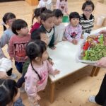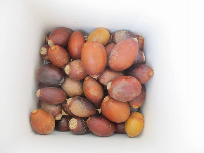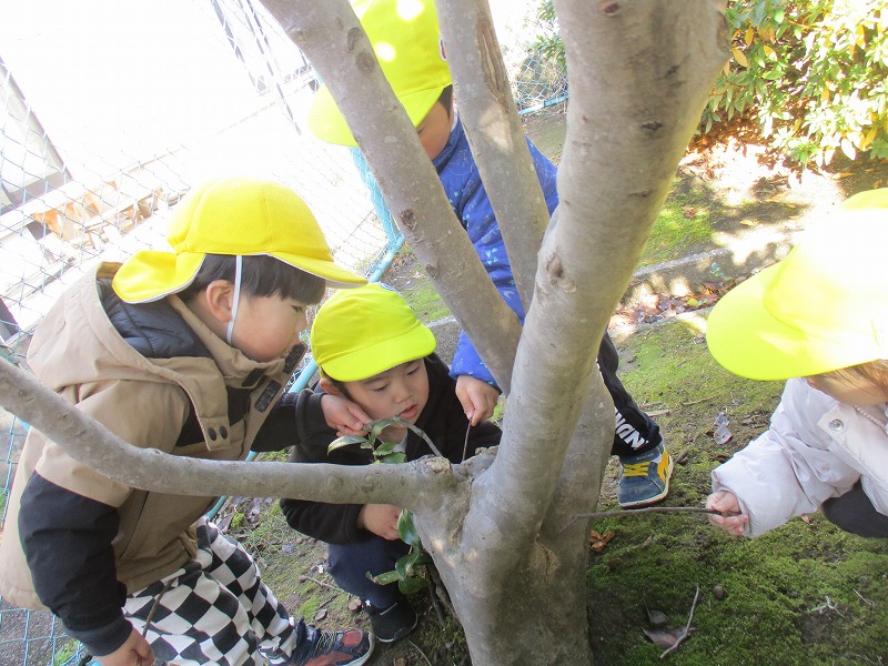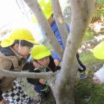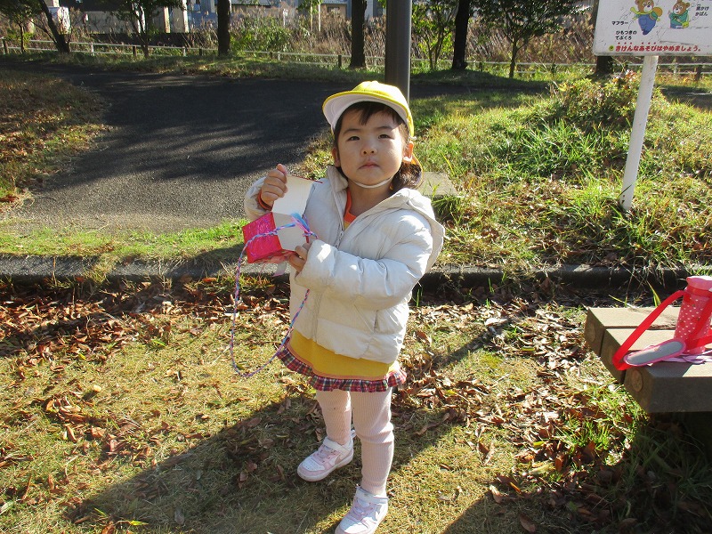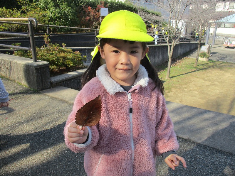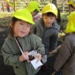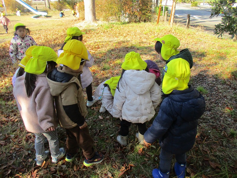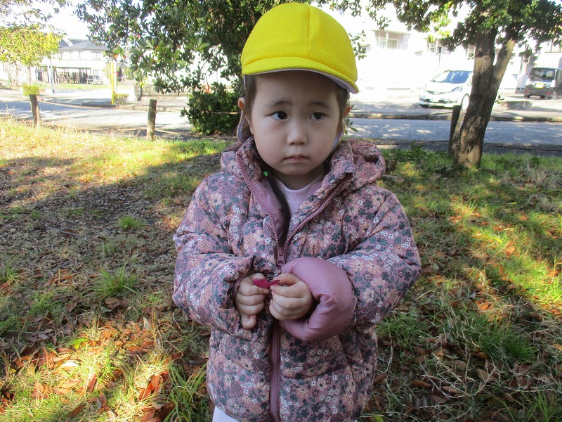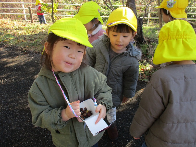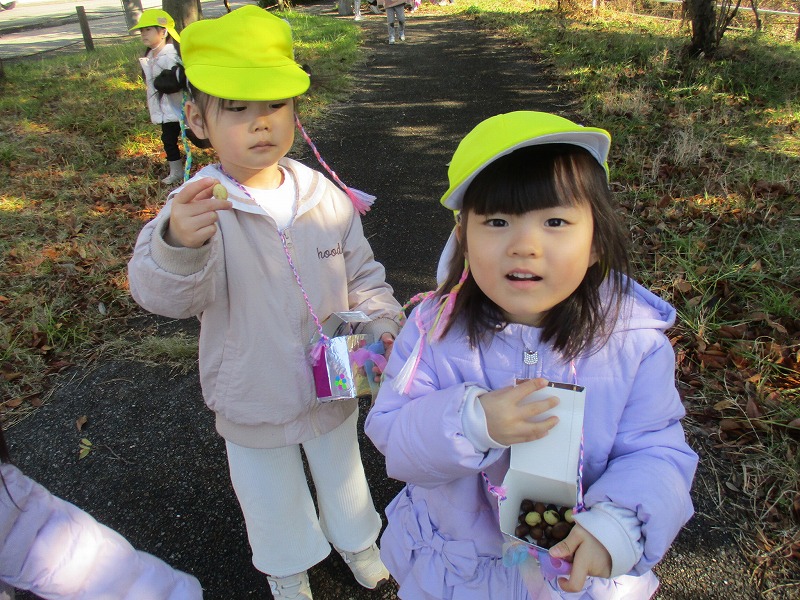 公園に出かけると、どんぐりや木の実、落ち葉などたくさんの秋に触れ合って遊んでいます。いろんな形や大きさ、色のどんぐりを見つけ、「おっきいね」「赤ちゃんどんぐりだね」「これ丸いよ~」と友だちと気づきを共有していました。