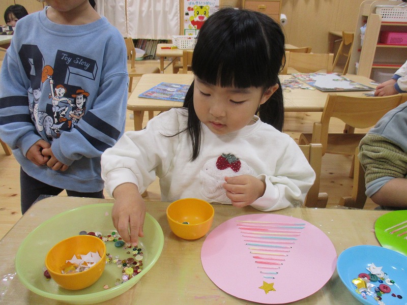 その後、スパンコールや綿、折り紙で切り抜いた星などを貼り付け、一人ひとりのイメージが詰まった素敵なツリーが完成しました。折り紙でサンタクロース作りにも挑戦し、「サンタさん来てくれるかな~」「もうすぐだね」と会話を弾ませながら楽しんでいました。