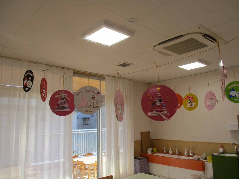 出来上がった制作物をお部屋に飾ると、「僕のあった!」「可愛いね~」と喜ぶ子ども達。クリスマス当日を心待ちにしながら、温かい雰囲気の中で過ごしています。