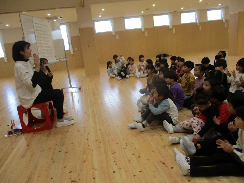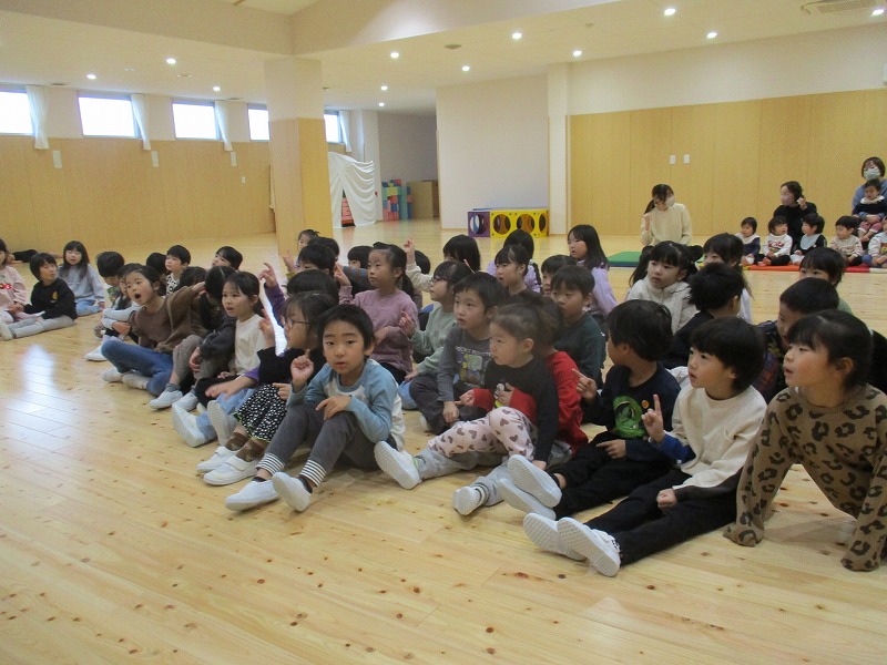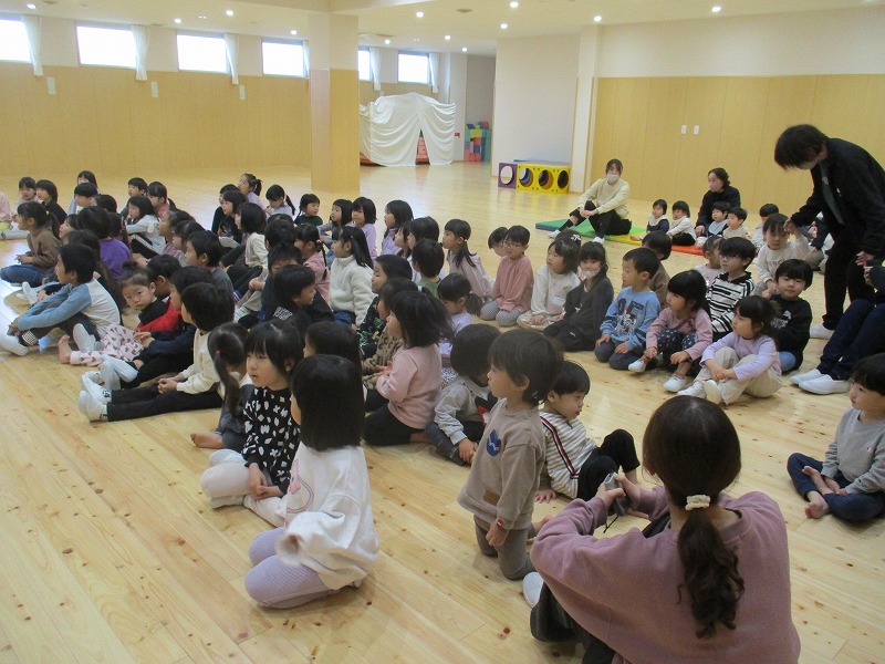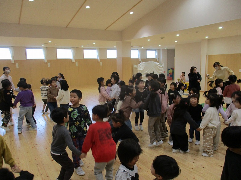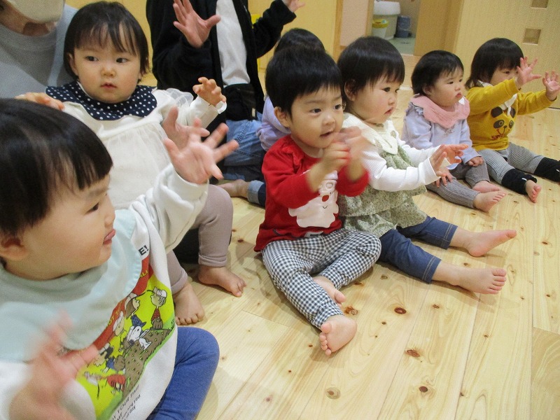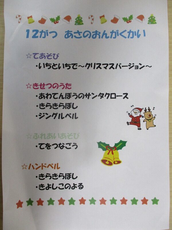 12月は、クリスマスの歌を歌いました。どの曲も知っている子が多く、『あわてんぼうのサンタクロース』では、未満児さんが振り付きで歌ってくれていて可愛かったです。また、トーンチャイムでは、きりん組さんが音階の音を分担して鳴らしてくれました。素敵な音色を披露してくれ、たくさん拍手をもらっていました。今年の音楽会はこれで終わりでしたが、来年も子ども達と楽しい雰囲気で朝の音楽会を進めていきたいと思います。
