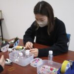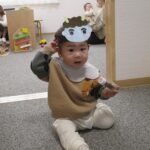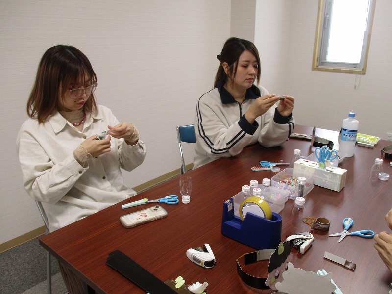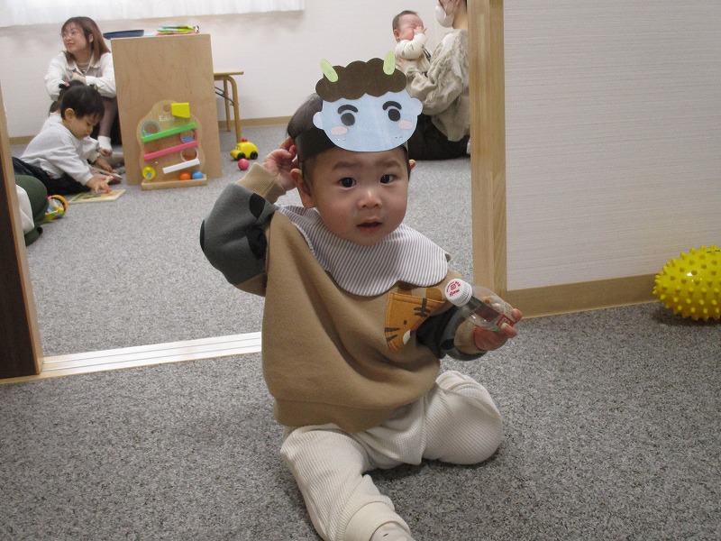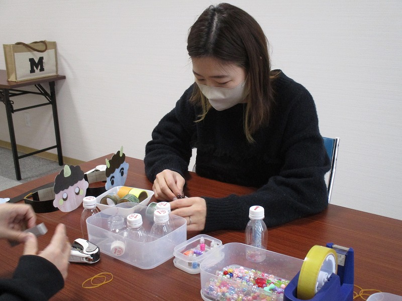 鬼のお面を作りたかったのですが、今年度の参加者さん達は割と月齢が低いお子さんが多いのでお面はほぼ完成した状態でお渡しし、ママさん達が少しでも癒されるように乳酸飲料の空容器をリサイクル、可愛い手作りの万華鏡ができあがっていました