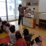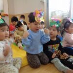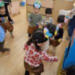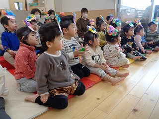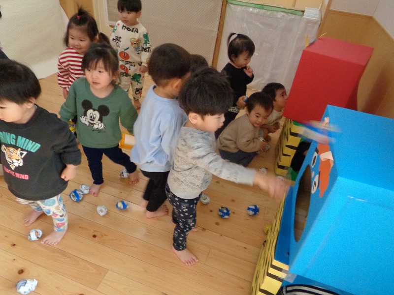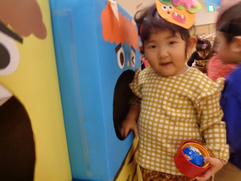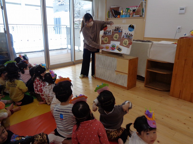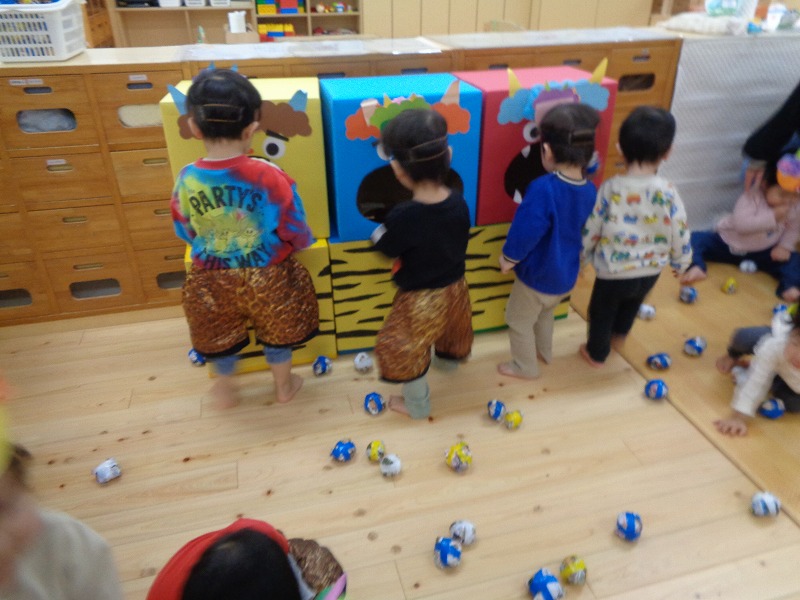 2月節分にちなんでおにのお面を作ると嬉しそうに身につけて遊んでいました。ズボンを用意すると好きなものを選んで履いてなりきっていました。新聞紙を丸めて豆に見立てて「おには~そと!ふくは~うち!」と言いながら豆まきごっこをして楽しんでいました。節分についてのお話を聞いたり歌をうたい無病息災を願いました。